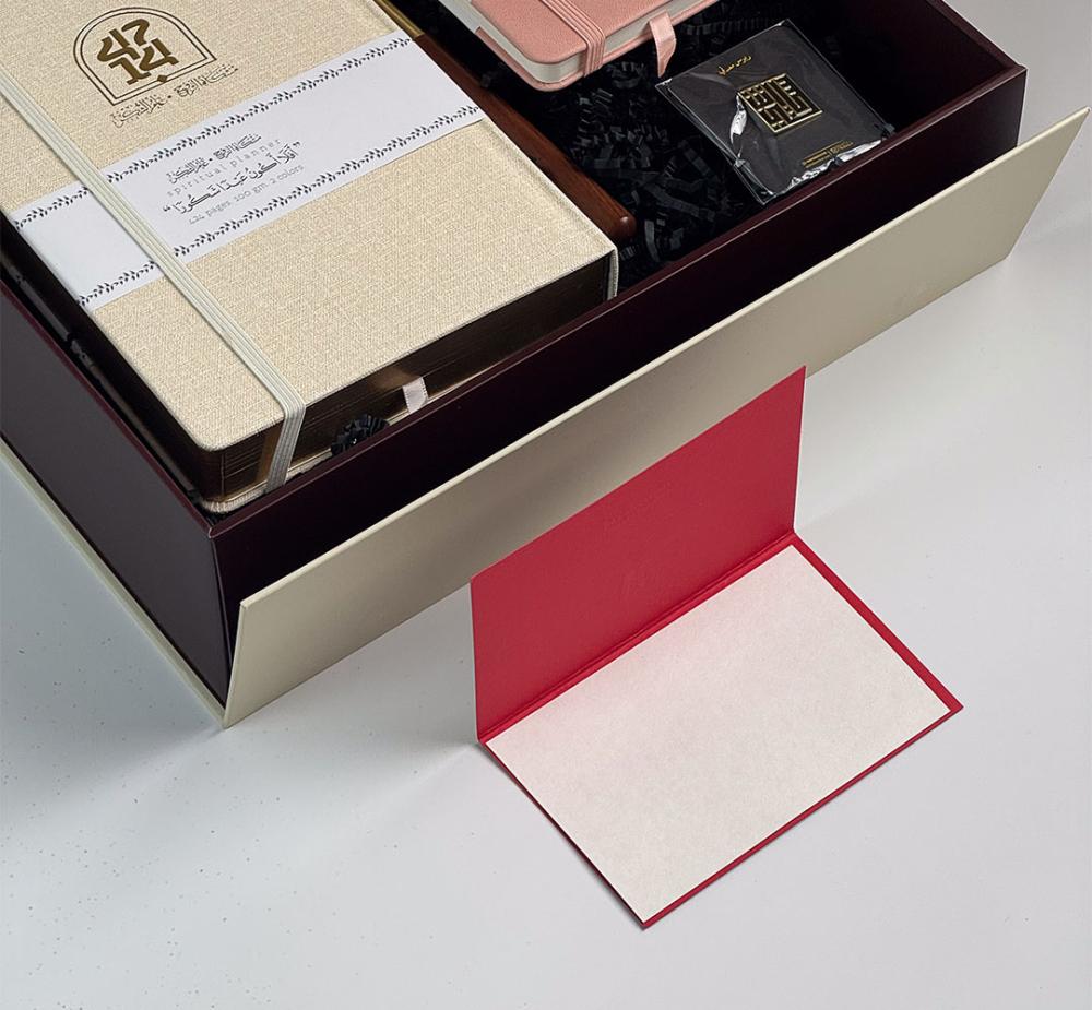 يحتوي البوكس على كارت إهداء يمكننا كتابة الرسالة عليه حسب طلبك، أو تركه فارغًا لتكتب انت الإهداء يدويًا.